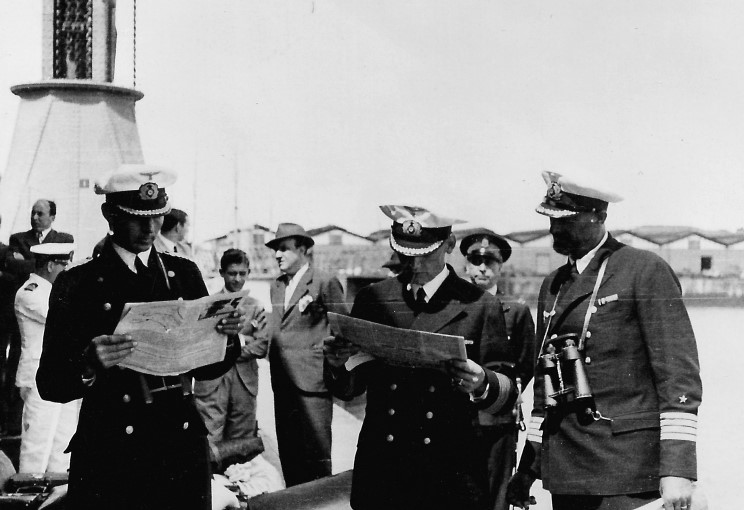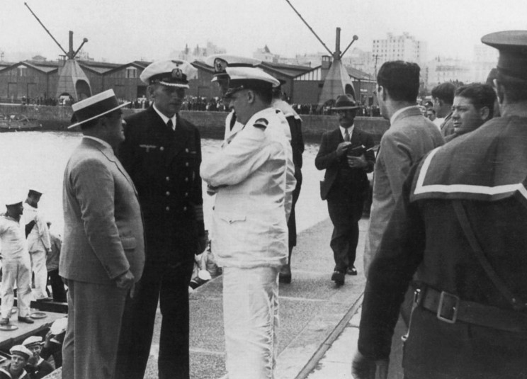 December 18, 1939: Kapitän zur See Hans W. Langsdorff speaking with officials of the Argentinean navy in