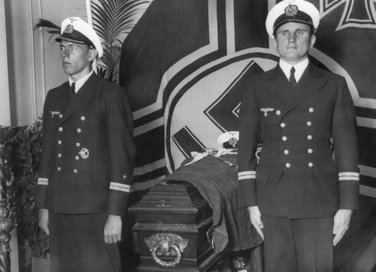 December 20, 1939: An honor guard stands next to the coffin of Kapitän zur See Hans W. Langsdorff.
