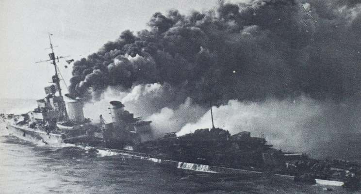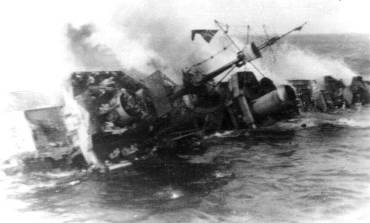 March 29, 1942: Z-26, flag still flying, rolling over and sinking in the Barents Sea. |