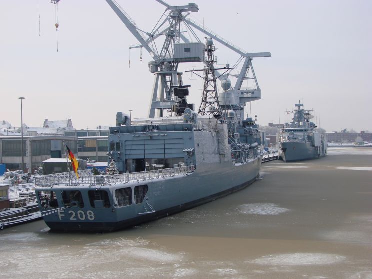 December 18, 2010: Niedersachsen F-208 and Bayern F-217 seen at the Marinearsenal, Wilhelmshaven, Germany. |