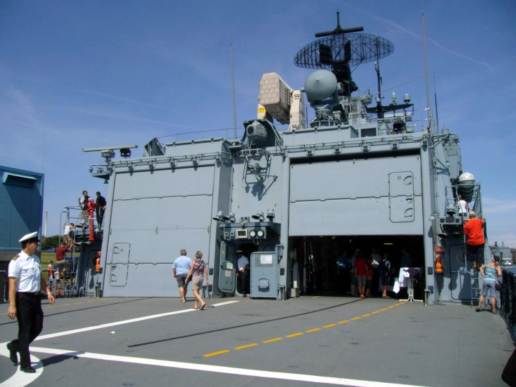 The flight deck and hanger on the stern of Bayern F-217, the aft Mk-49 RAM missile launcher is seen atop the hanger. |