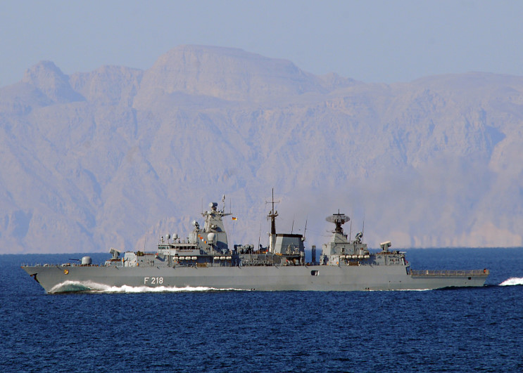 January 16, 2009: Mecklenburg-Vorpommern F-218 in the Straits of Hormuz operating with the USS Iwo Jima  Expeditionary Strike Group conducting supporting maritime security operations.  |