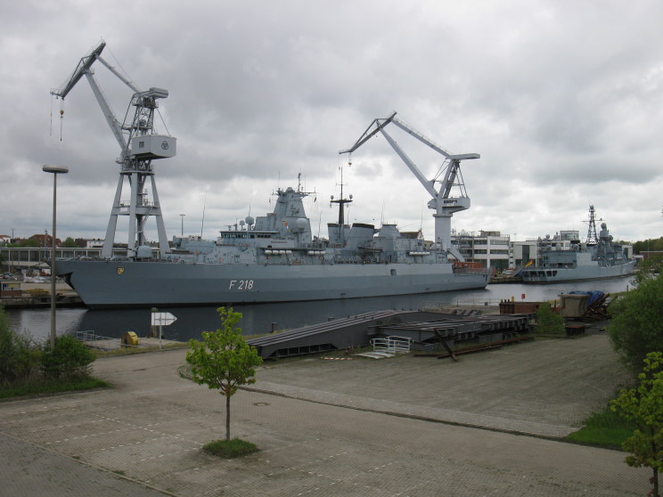 May 14, 2010: Mecklenburg-Vorpommern F-218 and Augsburg F-213 seen at the Marinearsenal, Wilhelmshaven, Germany.   |