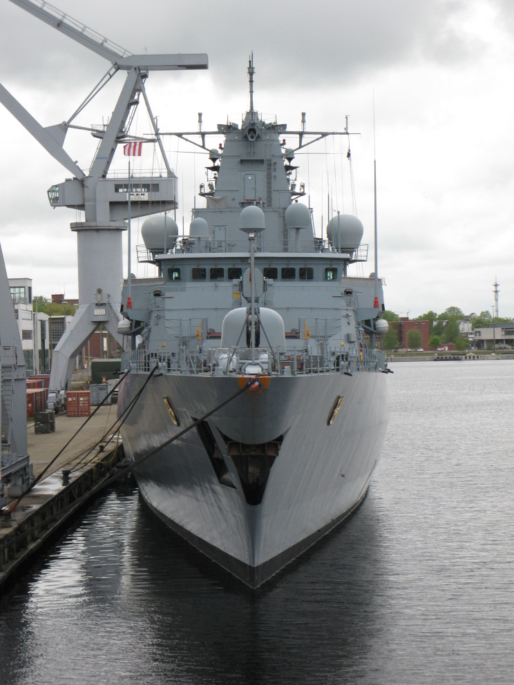 May 14, 2010: Bows on view of Mecklenburg-Vorpommern F-218 at the Marinearsenal, Wilhelmshaven, Germany.   |