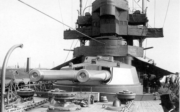 The forward 12"/45 (305mm) guns on the HMS New Zealand. |