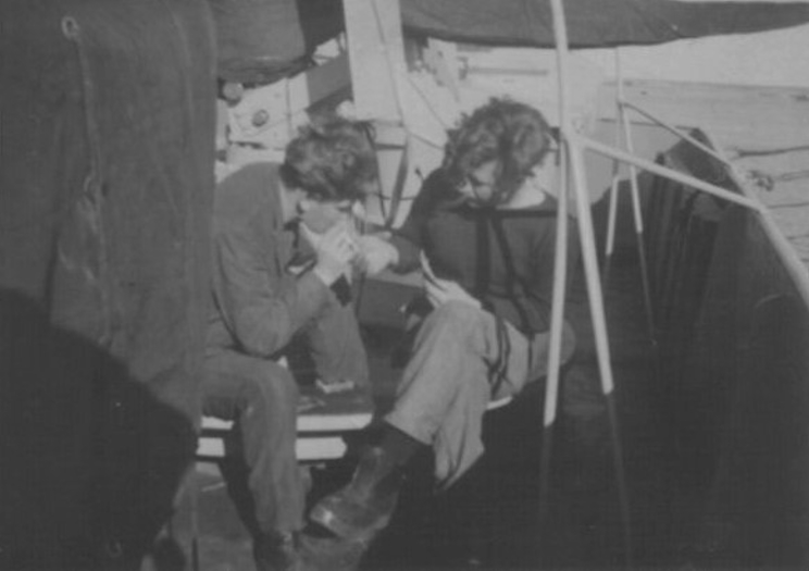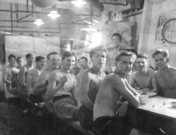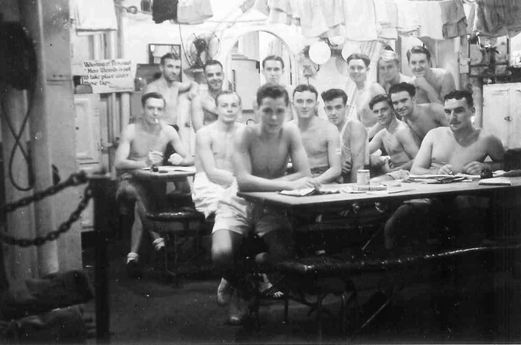 Crewman of HMS Colossus during World War II, Jim R. Steel is seen on the far left (with cigarette). |