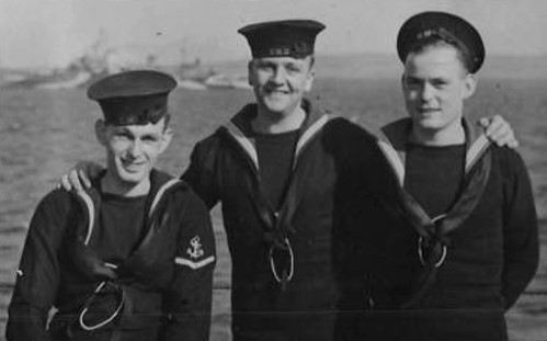 Frederick Ramsbottom (right) and two unidentified crewmen seen on HMS Indefatigable during the Second World War. |