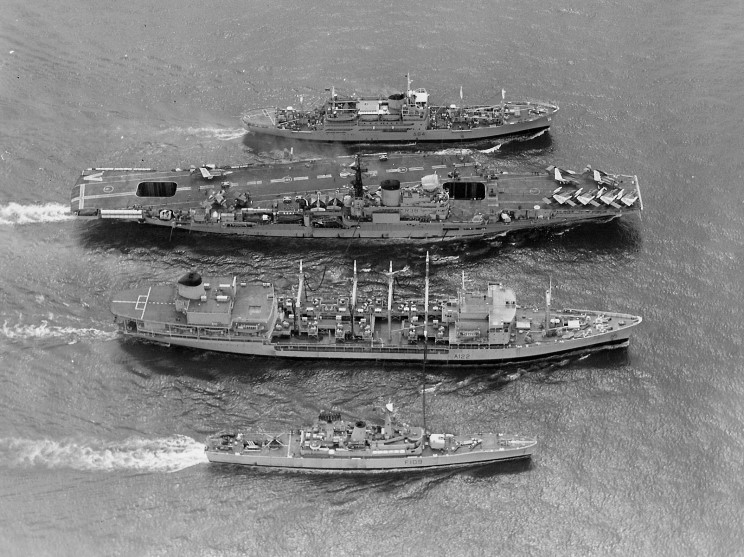 From top to bottom: RFA Reliant A-84, HMS Victorious R-38, RFA Olynthus A-122 (later RFA Olwen) and  HMS Leander F-109 seen off Singapore about 1966.  |