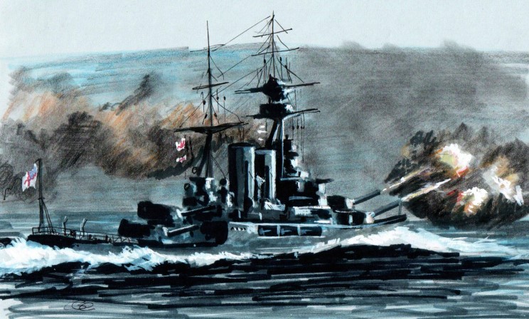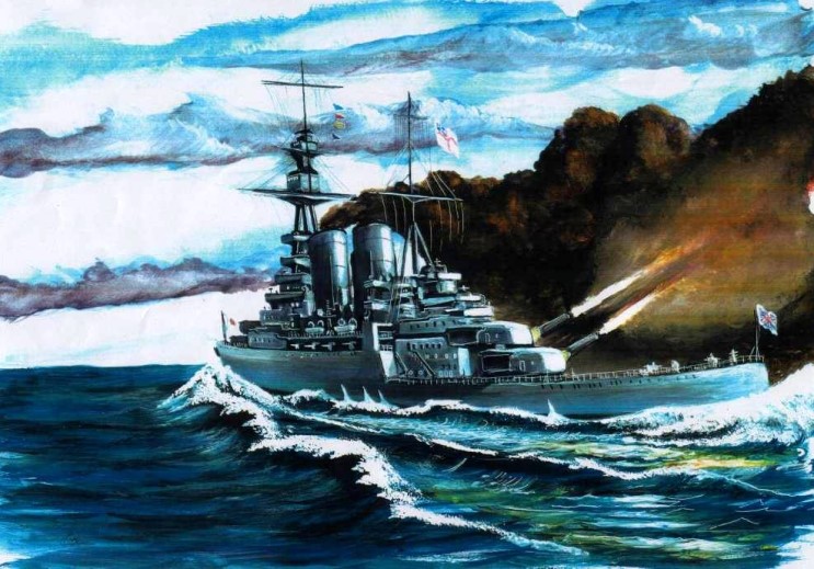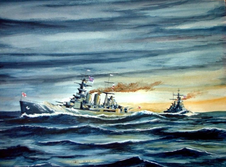 Portrait of HMS Hood and HMS Prince of Wales during the Battle of the Denmark Strait by Alan Blair. |