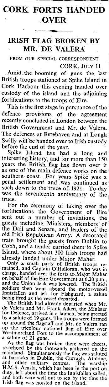 11. Feb. 19, 2011 Would you or any of your correspondents be able to confirm if HMS Rodney was at Spike Island, Queenstown, Ireland on July 11th 1938? The occasion was the handing over of the "Treaty Ports" in Ireland to the Irish government. These ports had remained under British Navy jurisdiction since the Treaty of 1921 when part of Ireland gained independence, and were then handed over. I was at Queenstown on the date in question and believe that I saw "Rodney" at the quayside. I would like to be able to confirm this for some family history which I am compiling. Sean Linehan Hassocks, UK |