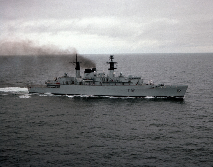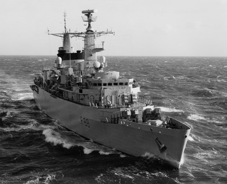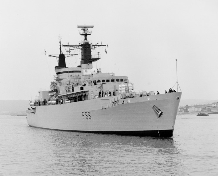 HMS Broadsword F-88 seen in 1983 proceeding up the Tamar towards Devonport.