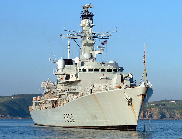 HMS Norfolk F-230 departing Devonport Dockyard and about to exit the Hamoaze and enter Plymouth Sound, Mount Edgcombe Park is seen in the background.