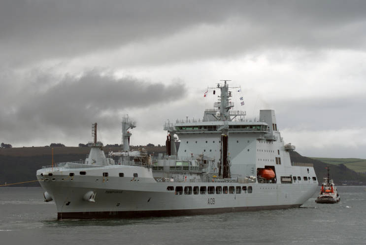 June 13, 2019: RFA Tideforce A-139 seen entering the Tamar River at Plymouth, England. The tugs SD Powerful and SD Forceful are providing assistance. |