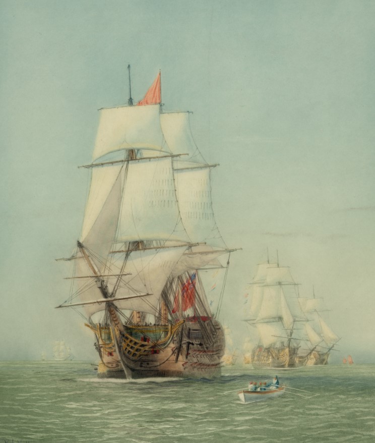 Portrait of HMS Victory at the Battle of Cape St. Vincent February 14, 1797 by Derek G. M. Gardner. |