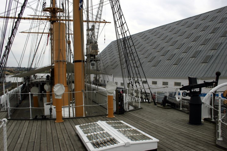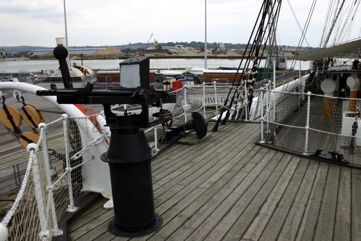 September 17, 2008: Looking aft from the bow of HMS Gannet, the port 1" Nordenfeldt quad barrel heavy machine gun is seen at right. |