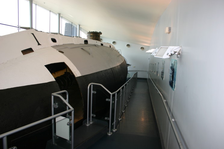May 13, 2008: The starboard side of the Holland 1, on display at the Royal Navy Submarine Museum in Gosport,