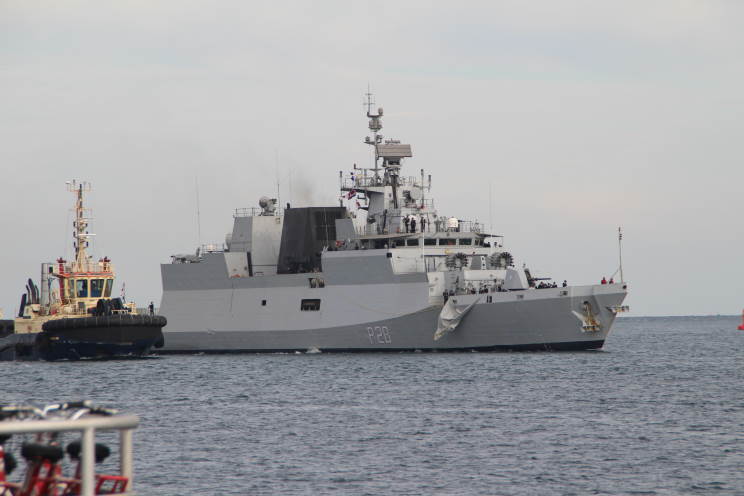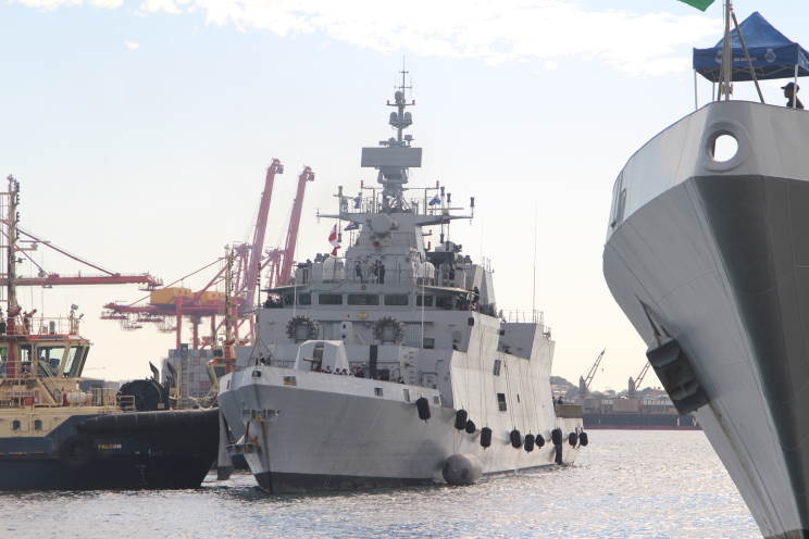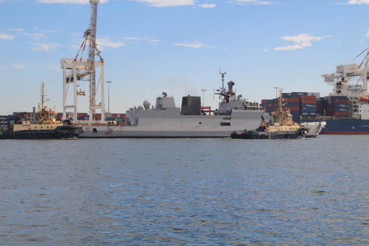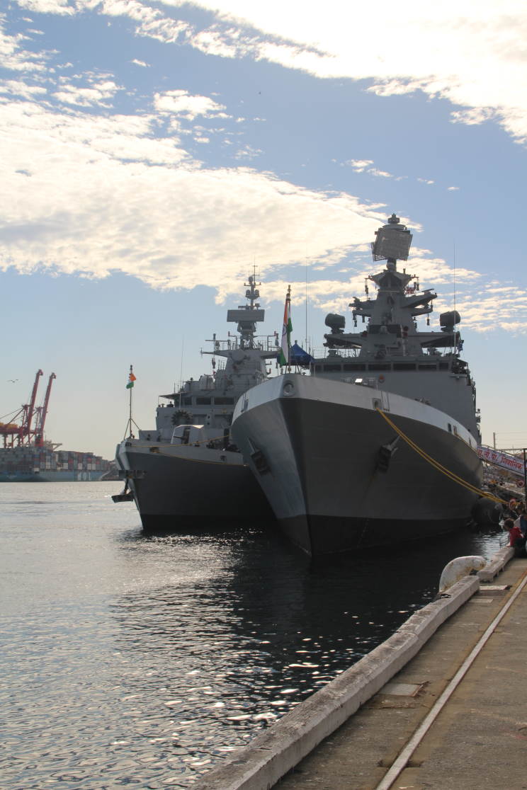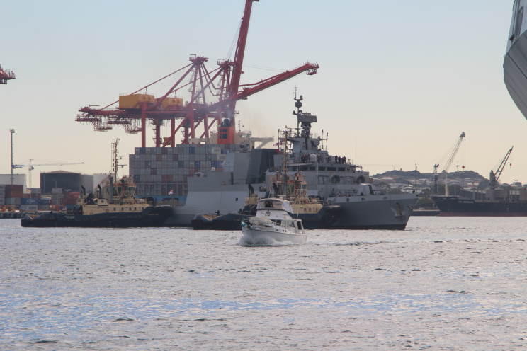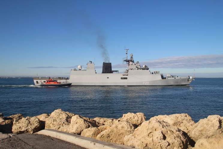 June 13, 2017: INS Kamorta P-28 assisted by the tugs Svitzer Falcon and Svitzer Eagle (not shown) arriving at Fremantle Harbour, WA, Australia to participate in AUSINEX 17. |