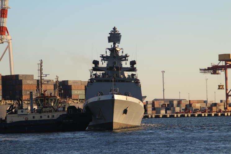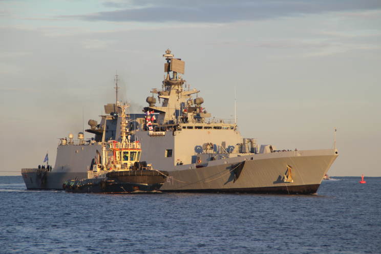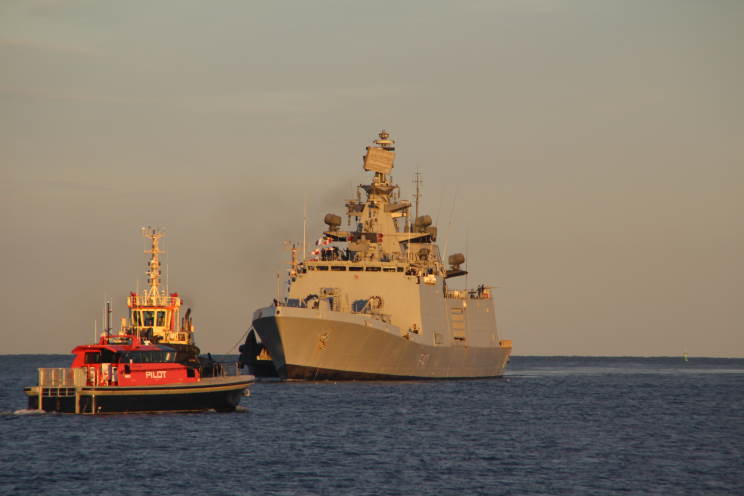 June 13, 2017: INS Shivalik F-47 assisted by the tugs Svitzer Eagle and Svitzer Falcon (not seen) arriving at Fremantle Harbour, WA, Australia to participate in AUSINEX 17. |