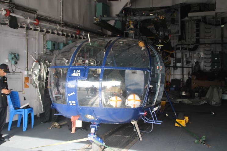 The HAL Chetak SA-316B helicopter on board INS Shivalik F-47. |