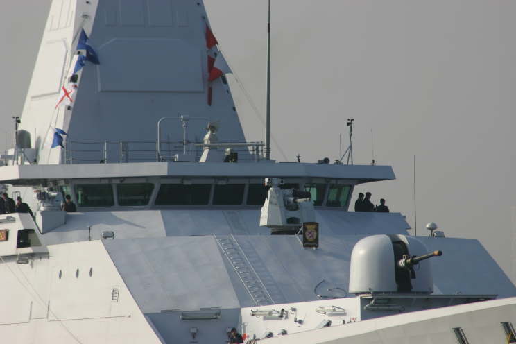 Close-up of the bridge and forward armaments on HNLMS Holland P-840. |