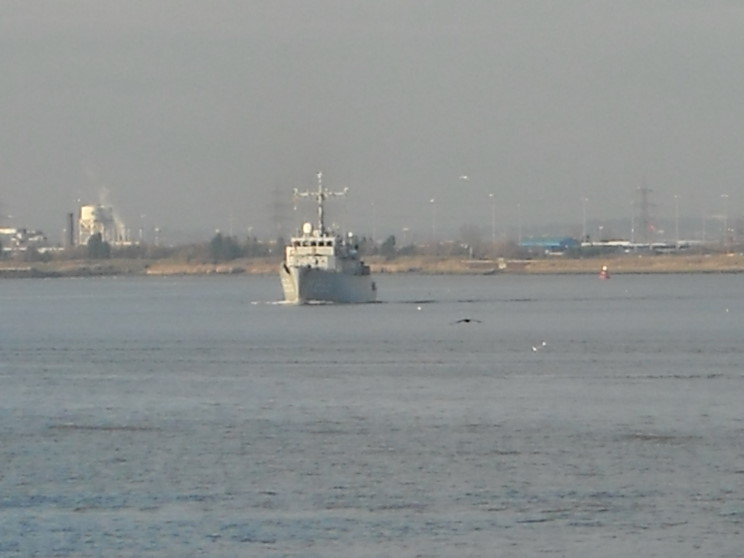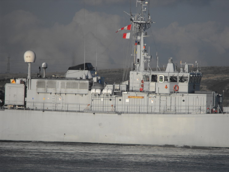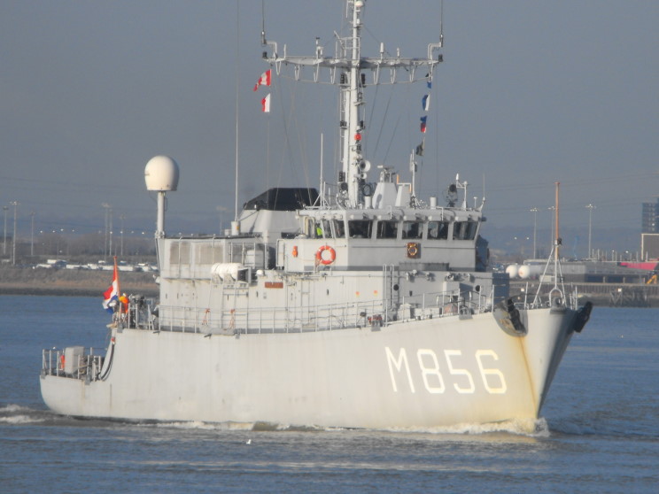 December 14, 2009: HNLMS Maassluis M-856 seen on the Thames River at Erith, England after leaving London following a port visit. |