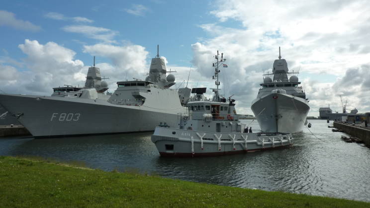 July 1, 2011: HNLMS Tromp F-803 seen at Den Helder, Netherlands during Marinedagen. HNLMS Linge A-874 is seen guiding HNLMS De Ruyter F-804 into her berth. |