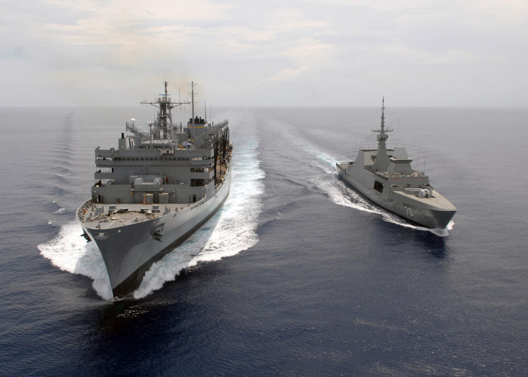 April 15, 2008: RSS Steadfast 70 and USNS Rainer T-AOE-7 seen during a simulated refueling at sea.