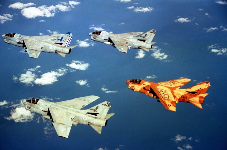 June 5, 1991: Four A-7E Corsair II aircraft from Attack Squadron 72 (VA-72) returning to the USA following deployment in Operation Desert Storm. The rear aircraft is that of Commander and Deputy Commander of Air Wing 3 (CVW-3). |