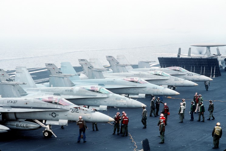 February 1993: F-18 Hornet's of Strike Fighter Squadrons VFA-37 and VFA-105 on the flight deck of the USS John F. Kennedy CV-67. |