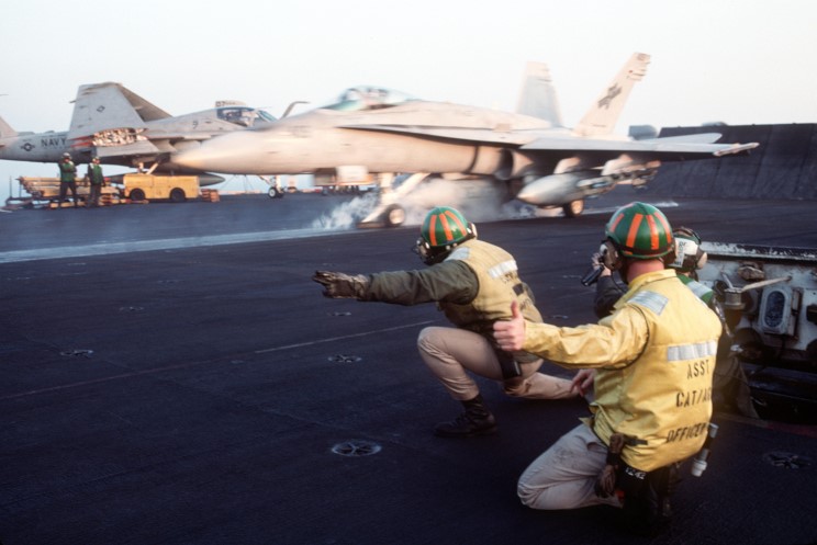 February 1993: An F/A-18C Hornet from Strike Fighter Squadron 105 (VFA-105) takes off from the USS John F. Kennedy CV-67. |