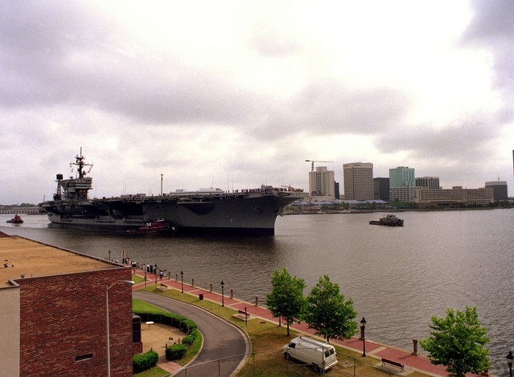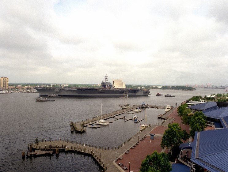 May 28, 1991: USS John F. Kennedy CV-67 making her way up the Elizabeth River en route to the Norfolk Naval Shipyard for an overhaul following deployment. |