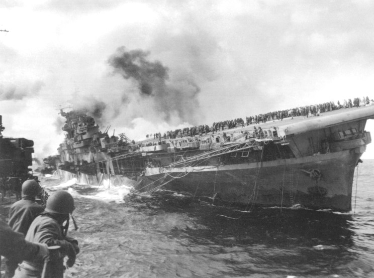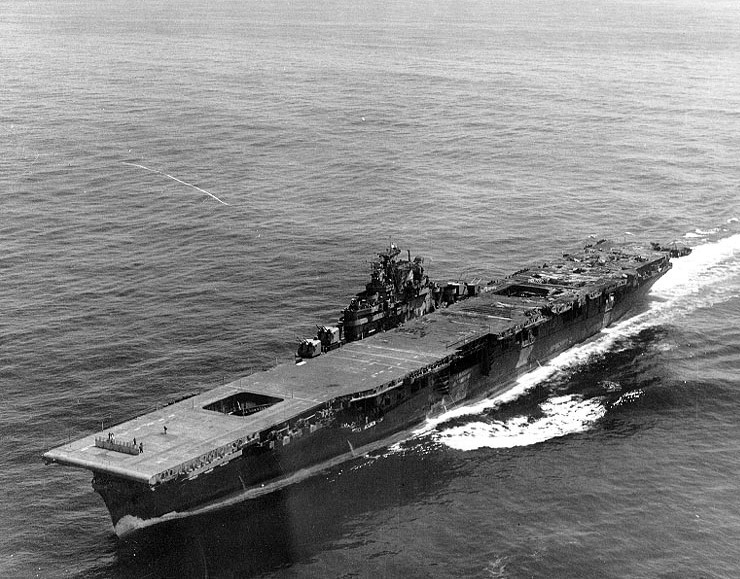 March 19, 1945: USS Franklin CV-13 after being bombed by Japanese aircraft off Honshu, Japan. Seven hundred and twenty four men were killed in the attack and the resulting fires.