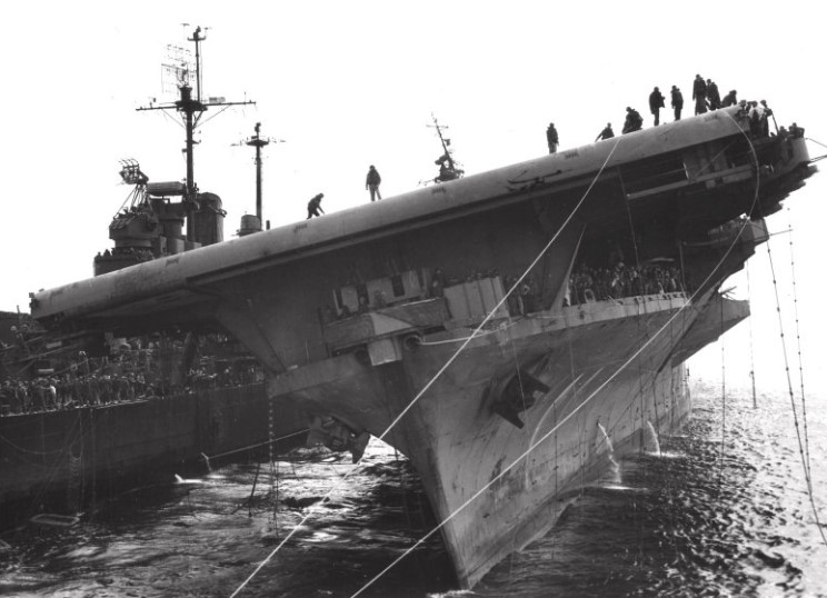 April 1945: USS Franklin CV-13 approaching New York for repairs.
