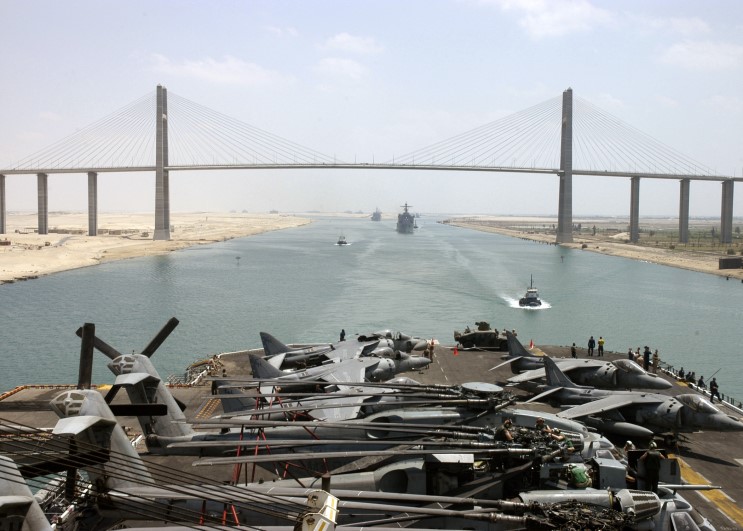June 1, 2007: USS Bataan LHD-5 follows the USS Oak Hill LSD-51 and the USS Shreveport LPD-12 under the Mubarak Peace Bridge while transiting the Suez Canal en route to the USA following deployment.