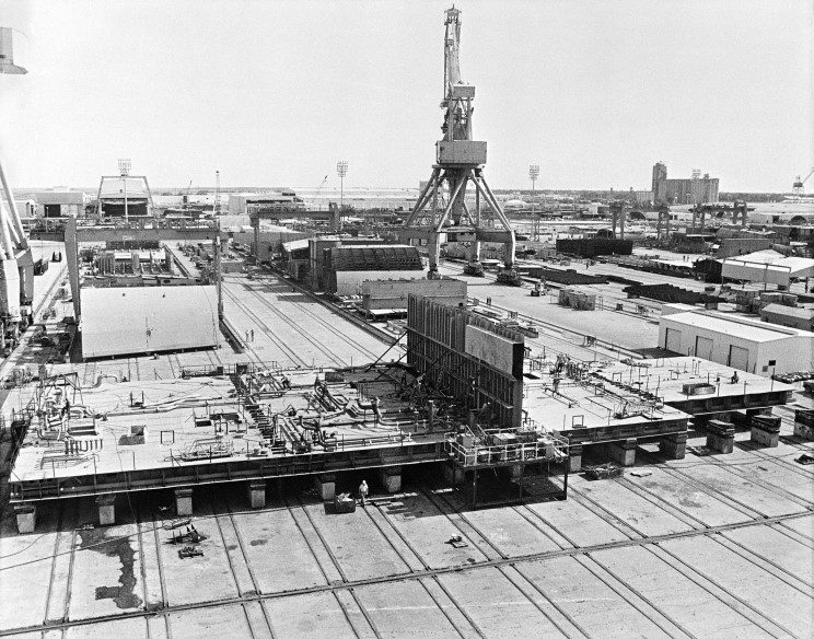 May 30, 1985: Keel laying ceremony for the Wasp LHD-1 at Litton-Ingalls Shipbuilding Corp., Pascagoula, Ms.