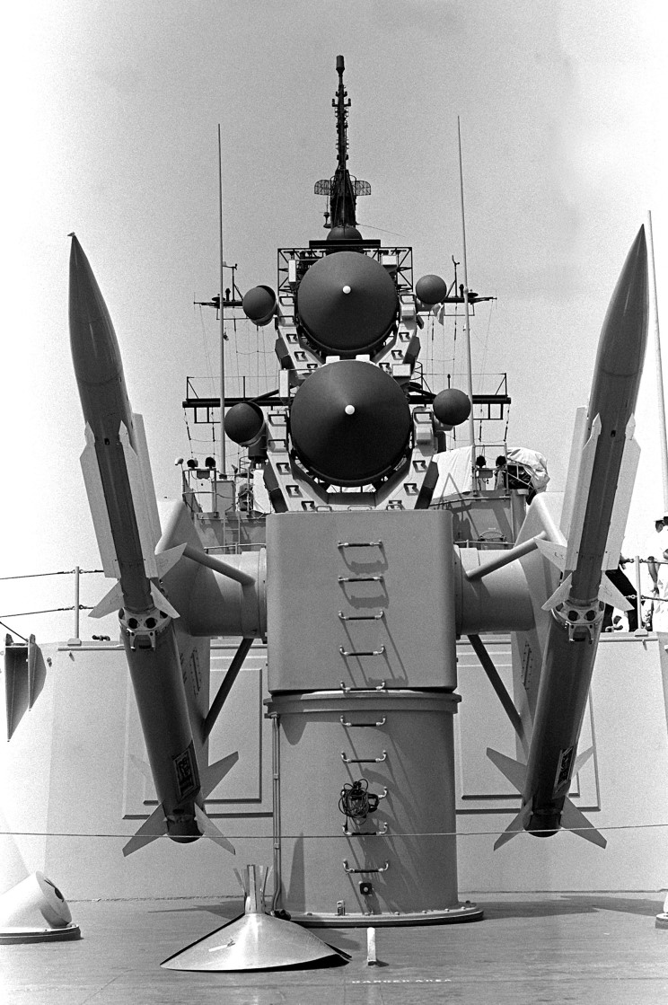 The Mk 10 twin missile launcher on the USS Dewey DDG-45 loaded with two RIM-67 SM-2 ER SAM missiles.
