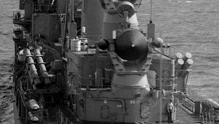 A RIM-67 SM-2 ER SAM missile on the missile house rail on USS Mahan DDG-42.