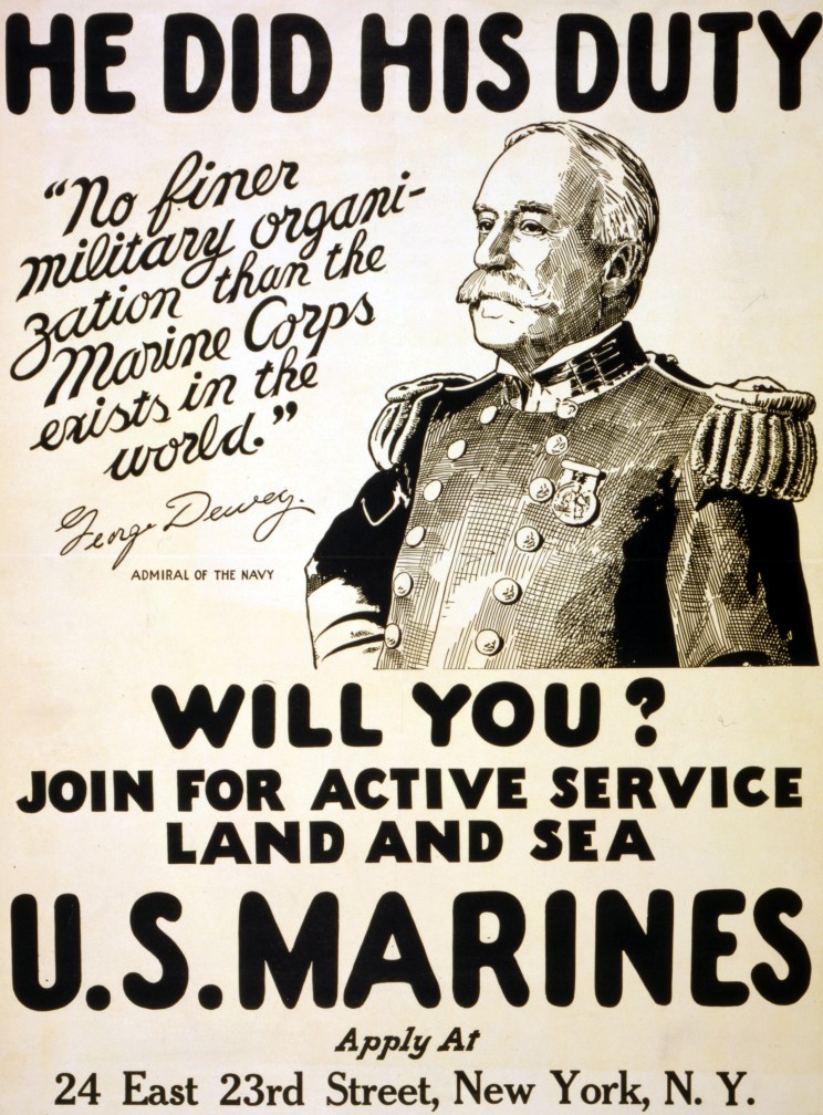 On 1 August 1889, he was commissioned Chief of the Bureau of Equipment, Navy Department, Washington DC. His term ended by resignation on 30 June 1893, when he again became a member of the Lighthouse Board. On 5 November 1895, he reported for duty as President of the Board of Inspection and Survey, Navy Department. On 30 November 1897, he was ordered to Asiatic Station and, proceeding by steamer, he assumed command on 3 January 1898, his flag in the protected cruiser, USS Olympia, Captain Charles V. Gridley, commanding. The Spanish-American War action at Manila, Philippine Islands, 1 May 1898, not only gave birth to the historical expression "You may fire when you are ready Gridley," but also liquidated the Spanish Fleet and installations in the Manila Harbor without loss of men to the US Fleet.
