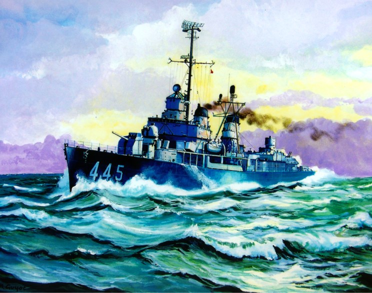 Portrait of the USS Fletcher DD-445 by Michel Guyot. (A 16"x20" print of this portrait is available in the MaritimeQuest Store.) |