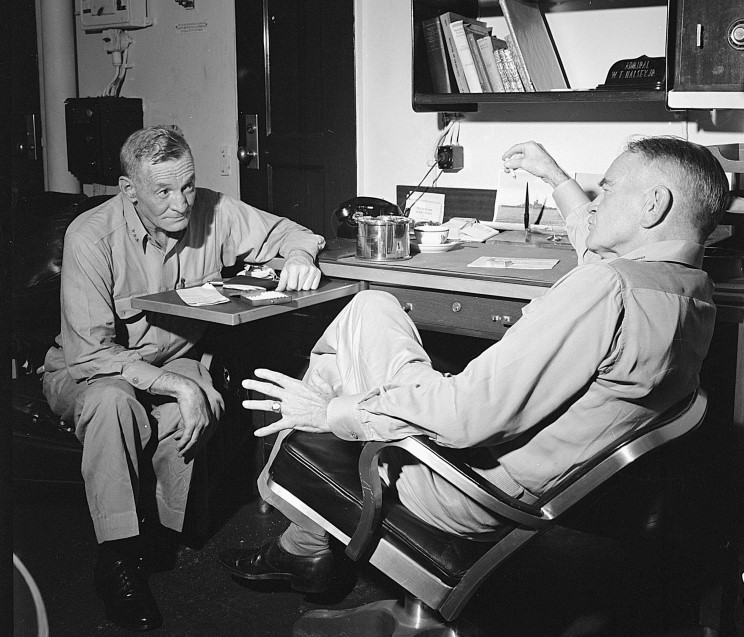 Vice Admiral John S. McCain Sr. and Admiral William F. Halsey on board USS New Jersey BB-63 en route to