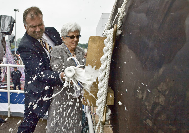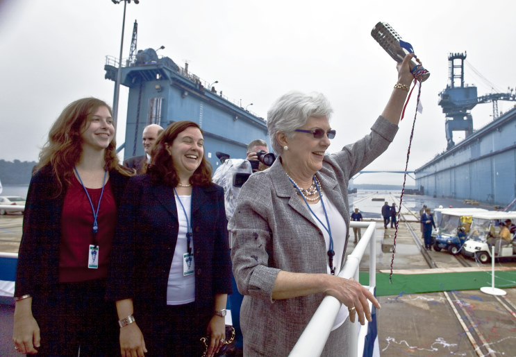 Ellen Spruance Holscher, ship's sponsor and granddaughter of Admiral Raymond A. Spruance, christens the new destroyer Spruance DDG-111 at General Dynamics Bath Iron Works. |