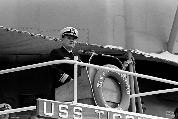 January 22, 1983: Rear Admiral Wayne E. Meyer speaking at the commissioning ceremony for Ticonderoga CG-47 in Pascagoula, Mississippi. |