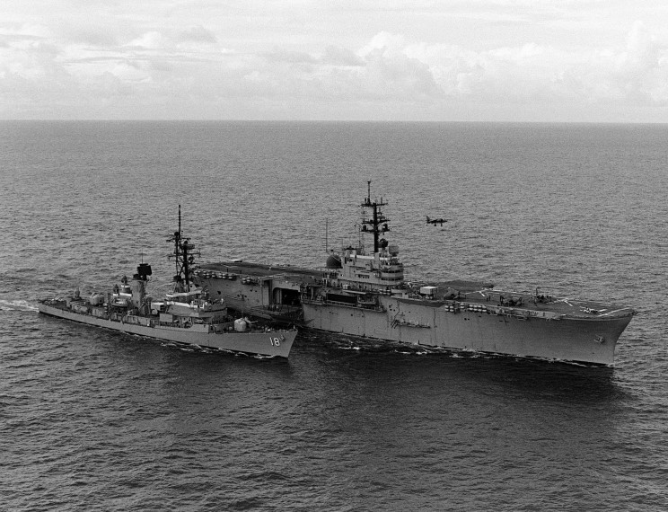 November 1983: USS Semmes DDG-18 conducting a replenishment at sea from the USS Guadalcanal LHP-7