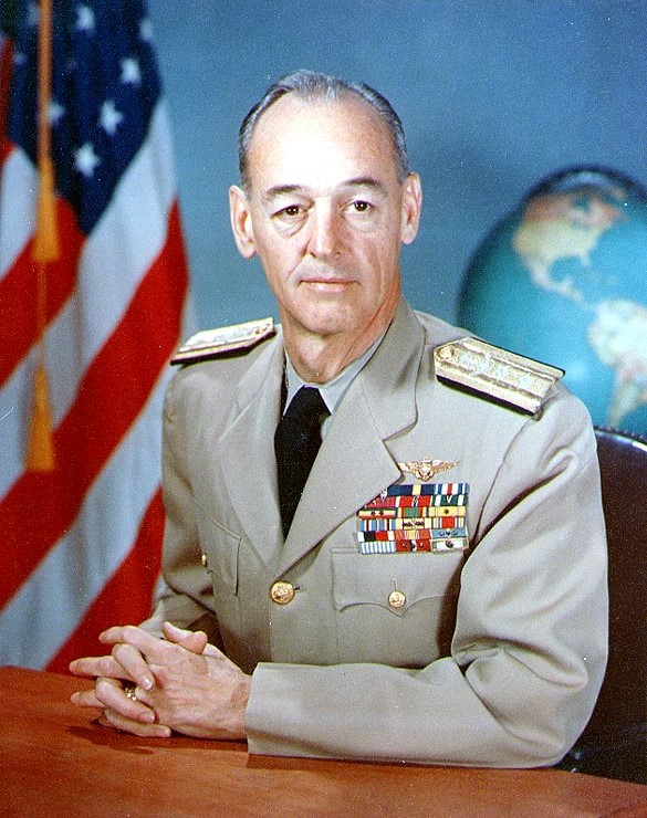 John S. Thach was born in Pine Bluff, Arkansas, on 19 April 1905. After graduation from the U.S. Naval Academy in 1927, he spent two years serving in battleships before entering flight training in 1929. Designated a Naval Aviator early in 1930, he received several flight assignments over the next decade and gained a reputation as an expert in aerial gunnery, test pilot and instructor. During the early 1940s, while commanding Fighting Squadron Three, Thach developed the fighter combat technique that came to be known as the "Thach Weave", a tactic that enabled the generally mediocre performing U.S. fighters of the day to hold their own against the Japanese "Zero". Lieutenant Commander Thach led "Fighting Three" from USS Lexington CV-2 in early Pacific actions, and from USS Yorktown CV-5 during the June 1942 Battle of Midway . After a period of instructing other pilots in combat tactics, Commander Thach became Operations Officer to Vice Admiral John S. McCain's fast carrier task forces, and was present at the Formal Japanese Surrender on 2 September 1945. Thach served in several air training staff assignments during the later 1940s. He commanded USS Sicily CVE-118 in action during the Korean War and USS Franklin D. Roosevelt CVA-42 in 1953-54. Attaining flag rank in 1955, he held a number of important assignments, including command of the antisubmarine development unit Task Group Alpha in 1958-59, with USS Valley Forge CVS-45 as his flagship. Rising to full Admiral over the next decade, Admiral Thach was Commander in Chief, U.S. Naval Forces, Europe, from March 1965 until shortly before his retirement in May 1967. He died on 15 April 1981. |