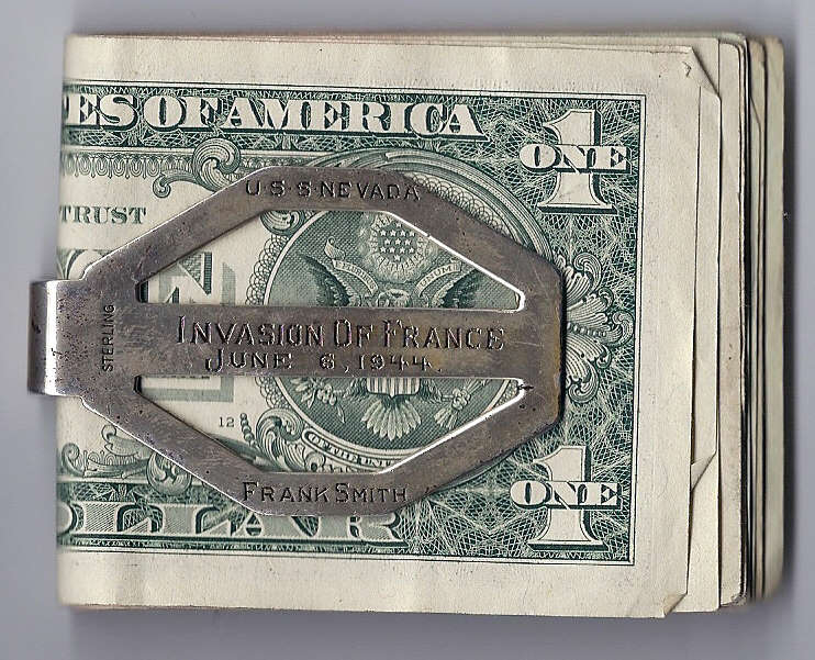 15. June 19, 2011 I received a money clip as a birthday present from a friend in Philadelphia, PA. He saved it from the melting pot. It is inscribed with the USS Nevada Invasion of France June 6,1944 Frank Smith. I am trying to establish a provenance for the money clip. Not to sell but to pass on for posterity. Was Frank Smith at Pearl Harbor when the Nevada was grounded? Or was he a replacement? Was this money clip duplicated for the entire crew with their individual names or did Frank Smith make this up as a remembrance? Has anyone seen a similar memento? Regards, Dominic T. Biello |